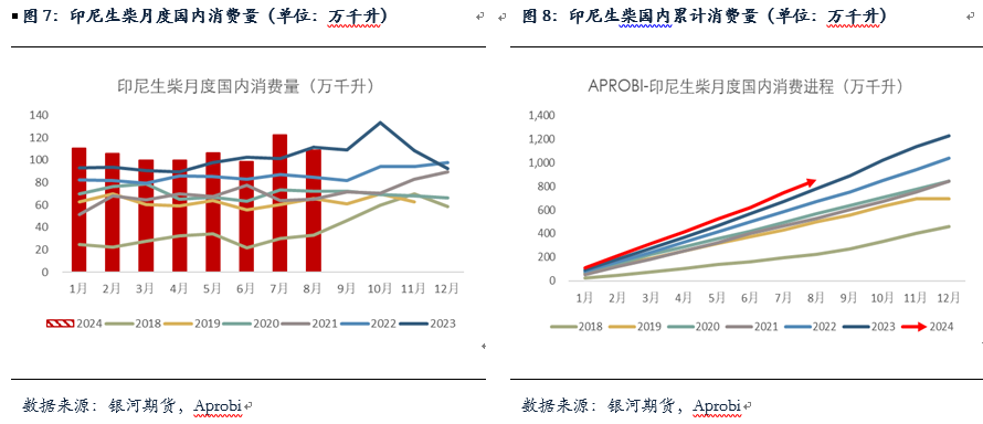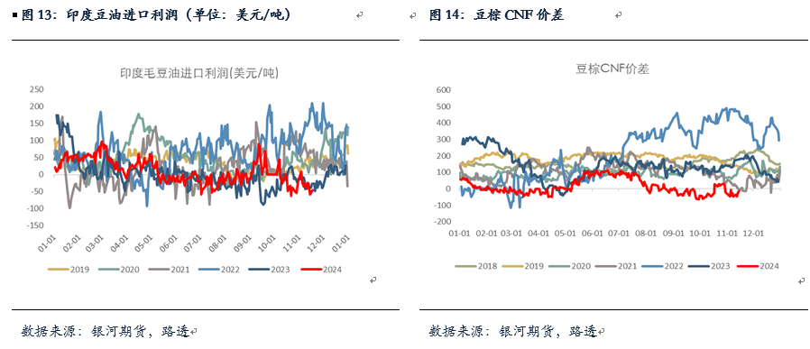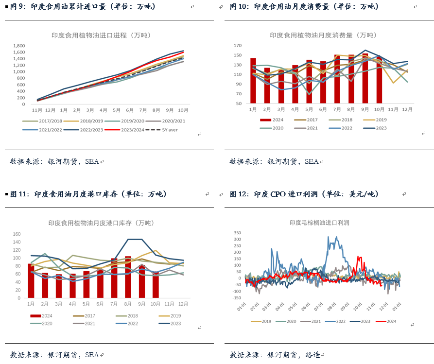 从表观消费上看,23/24年度印度消费量增速达到2%+,创出新高,展现出印度在经济快速发展的情况下,食用油消费非常强劲,目前印度棕榈油的消费量超过38%,豆油消费量占比约在21%,我们预计未来一个年度印度的消费量或将继续保持这一增速。