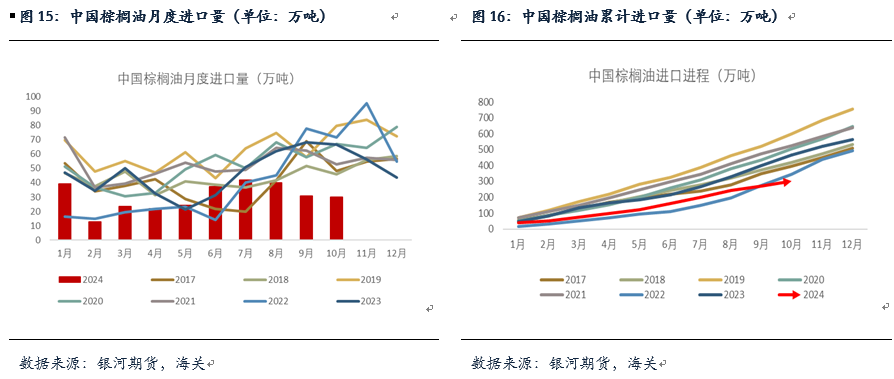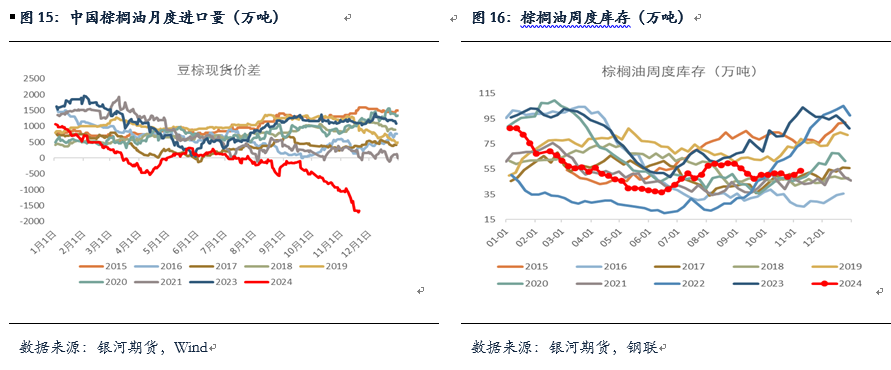 库存方面,截至2024年11月15日(第46周),全国重点地区棕榈油商业库存53.11万吨,环比上周减少0.77万吨,减幅1.43%,棕榈油小幅去库,整体上目前棕榈油库存处于历史同期较为偏低水平。豆棕现货价差持续走弱,截止到11月20日已经降至-1660元,棕榈油性价比较差,高价之下棕榈油现货成交持续偏低,提货一般,基差偏弱运行,整体呈现北强南弱,其中华南基差报在01+70。预计随着棕榈油11月陆续到港,国内库存在11月小幅累库之后,12月开始继续持续去库,库存持续偏紧。