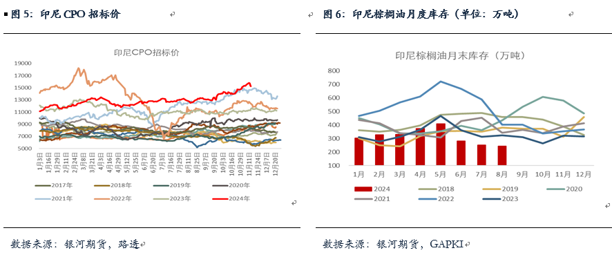 Gapki目前平衡表公布到8月,数据显示8月印棕继续去库至历史同期低位,仅245万吨。从印尼果串价格来看,近期北苏和廖内果串价格仍在震荡上涨,与此同时印尼CPO招标价持续处于历史同期偏高水平,一定程度上反映出印尼产量和供应并不宽松。随着印尼也将进入减产季,后期产量也将继续下降。出口方面,印尼统计局公布10月油棕产品(不含棕榈仁油)出口在233万吨,9月为148万吨,去年同期为230万吨,仍处于历史同期偏低水平。另外,按照目前的价格来看,预计12月印棕出口税费还将上调2-3个档位,棕榈油成本端将再次抬升。生柴方面,截止到今年8月印尼生柴累计消费达到853万千升,同比增加9%,处于历史同期高位,今年目标完成度在68%。印尼表示明年将实行B40强制掺混政策,但由于印尼供应偏紧,出口持续欠佳,生柴与柴油间的价差拉大使得需要补贴的额度增加,生柴基金余额明年可能面临消耗过量的问题,市场对印尼能否在明年年初顺利实行B40掺混政策存在质疑,盘面受此影响波动也增加,不过我们预计印尼生柴基金余额尚可维持到明年一季度,还需等待年底印尼对明年生柴配额目标的公布。
