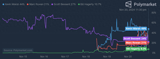 进入本周,美联储前理事凯文·沃什(Kevin Warsh)当选的概率有所反弹。加密货币博彩平台Polymarket的数据显示,特朗普提名沃什的几率一度达到49%,明显领先马克·罗文(Marc Rowan)等人。
